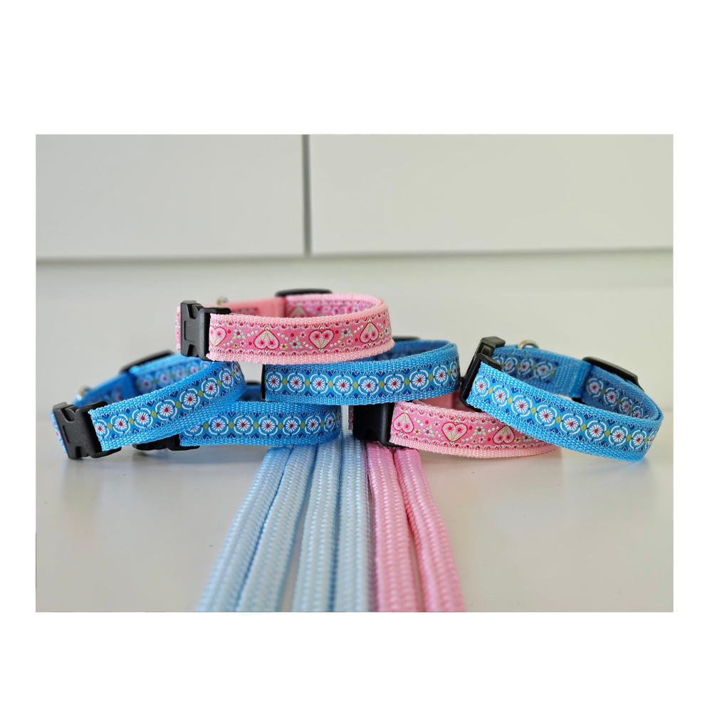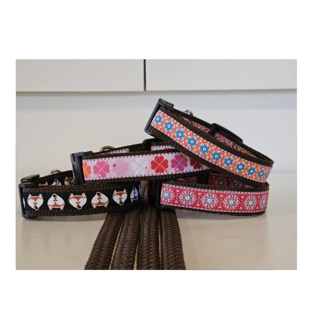 Vrolijke halsbanden met leren label waar de kennelnaam op staat